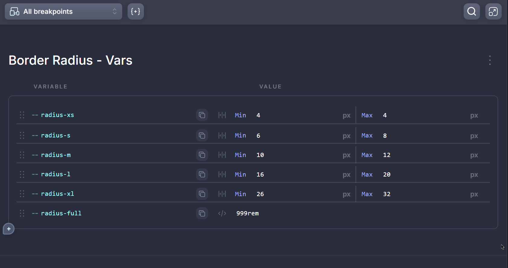 The image below shows that in variable manager in Bricks doesn’t have options to create different input type like adding min and max values.