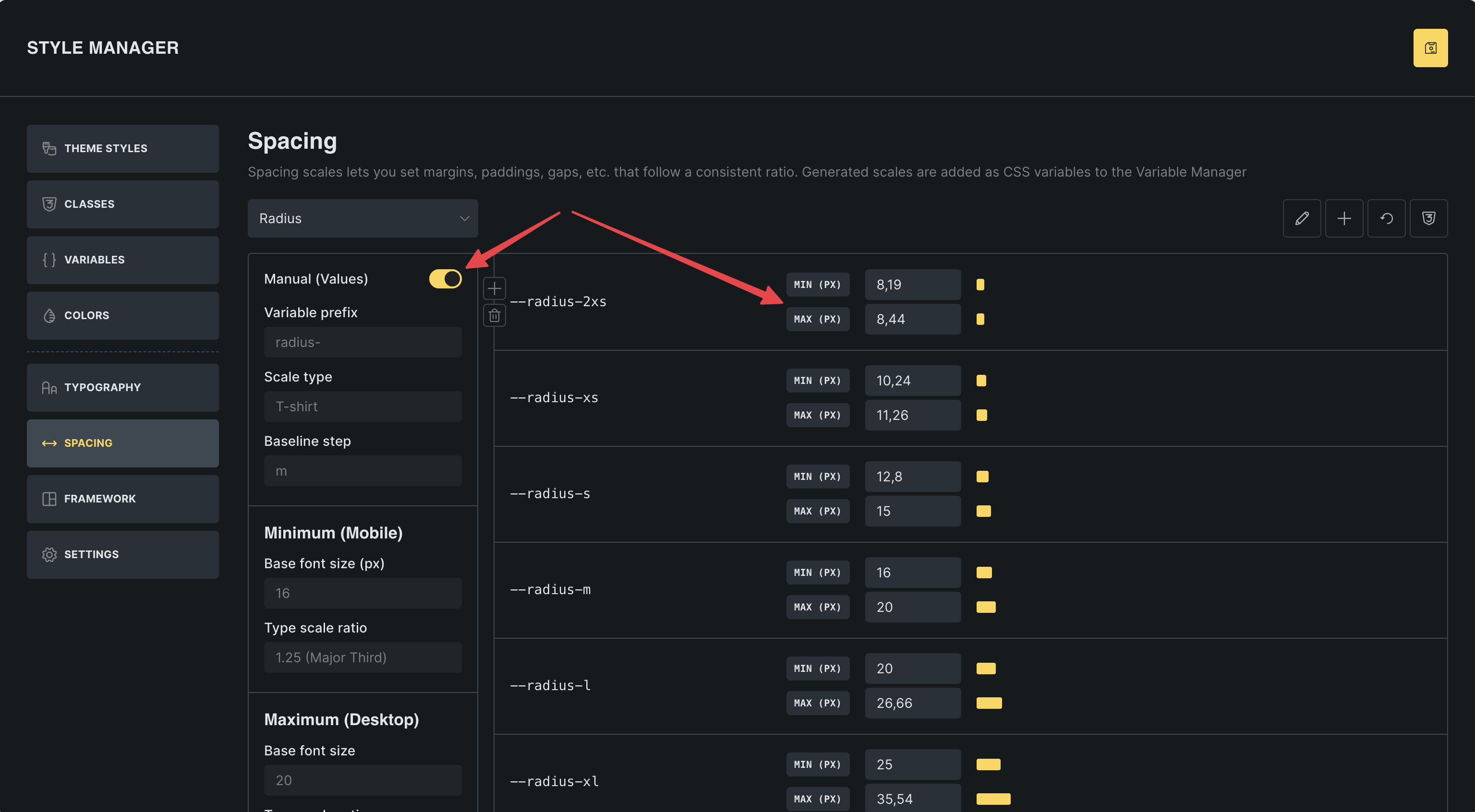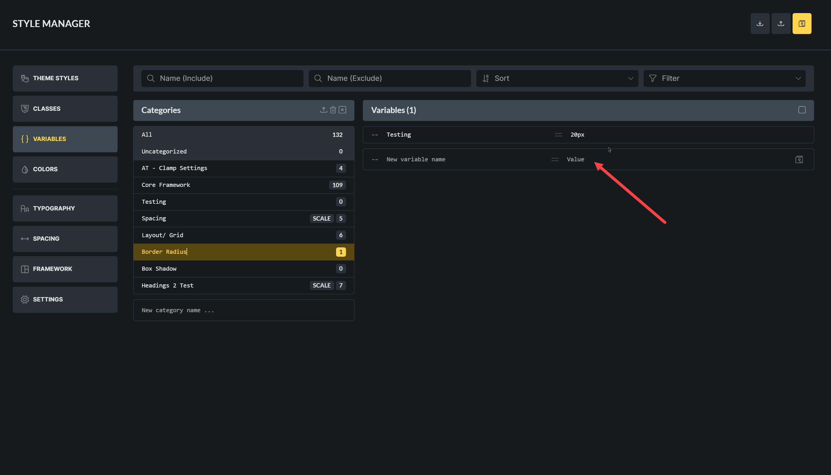 If you want to add a color variable, you can add it to the color palette, and the same for typography and spacing.