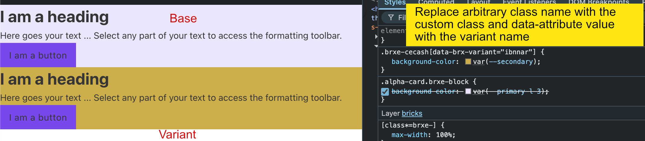 If I create a component variant the style applied to an arbitrary class name generated by bricks. Is it possible to use the base variant class and use the same class and it’s data-attribute value should be the name of the variant.?