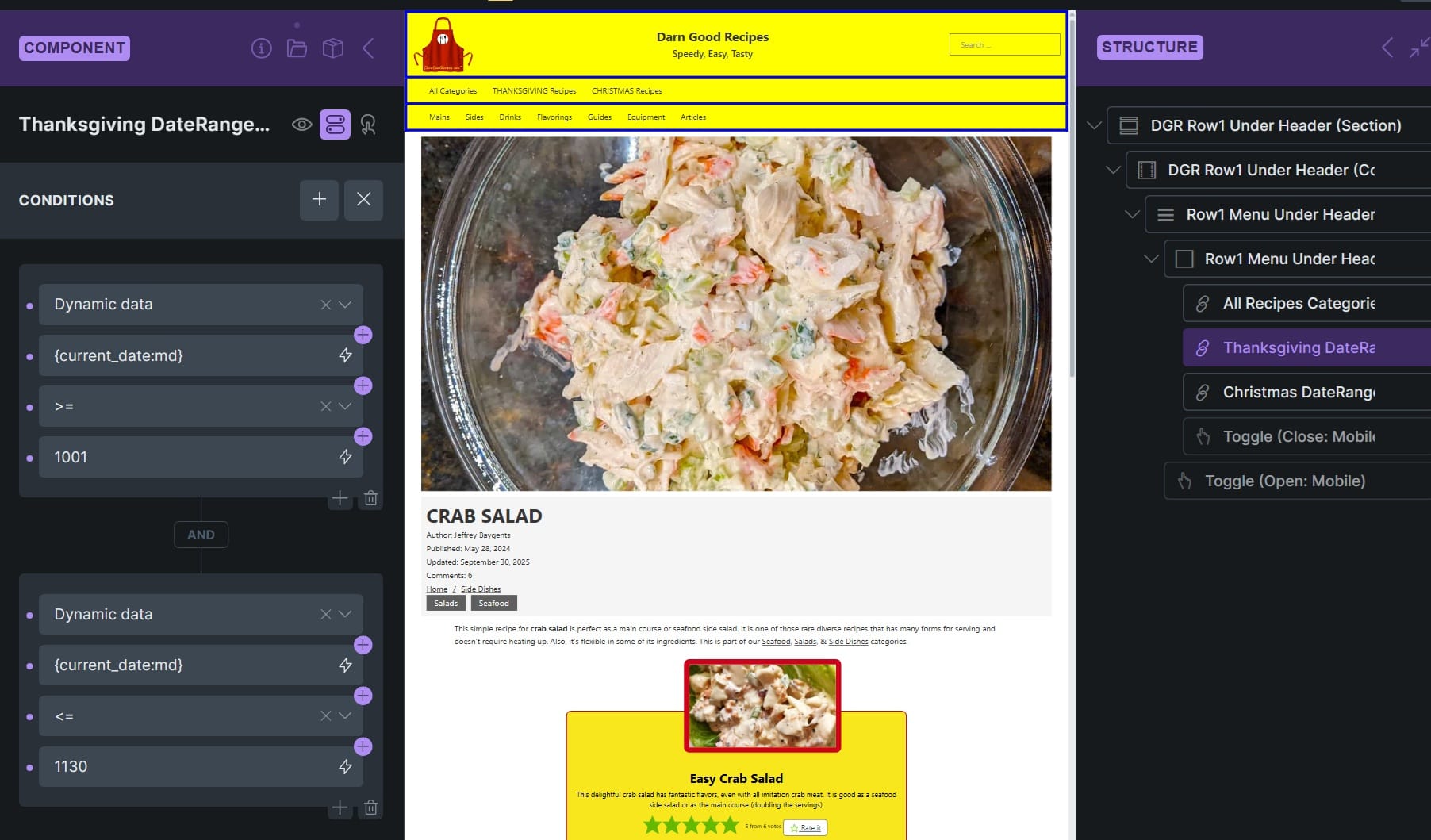 While in Bricks Edit mode, on the right “Structure” frame, tap the desired navigational menu item, e.g., “Thanksgiving Recipes” (named internally as “Thanksgiving DateRange” so it’s noticeable).