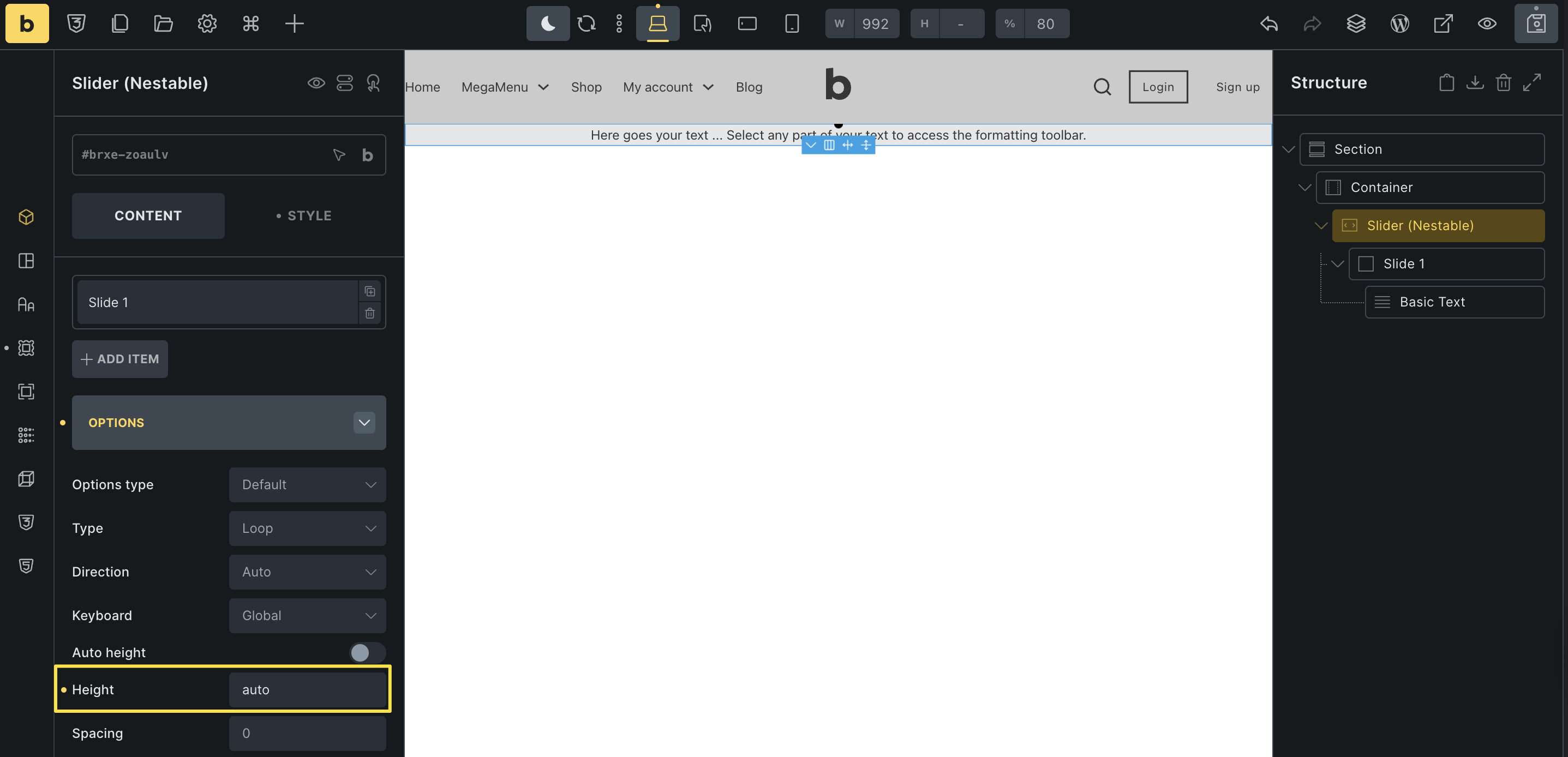 Hi there, I am using a nested slider module. I have a slide with a basic text element. The problem is that the slider defaults to min height of 50vh, I wish to make this smaller, but it is really finicky and seemly impossible to make the nested slider height smaller in the editor. I wish to not have a slider with nested paragraph to have a height of 50vh. Am I doing something wrong? I also change the height of the slider and the content to see if the height is set by child elements, but the layout breaks.