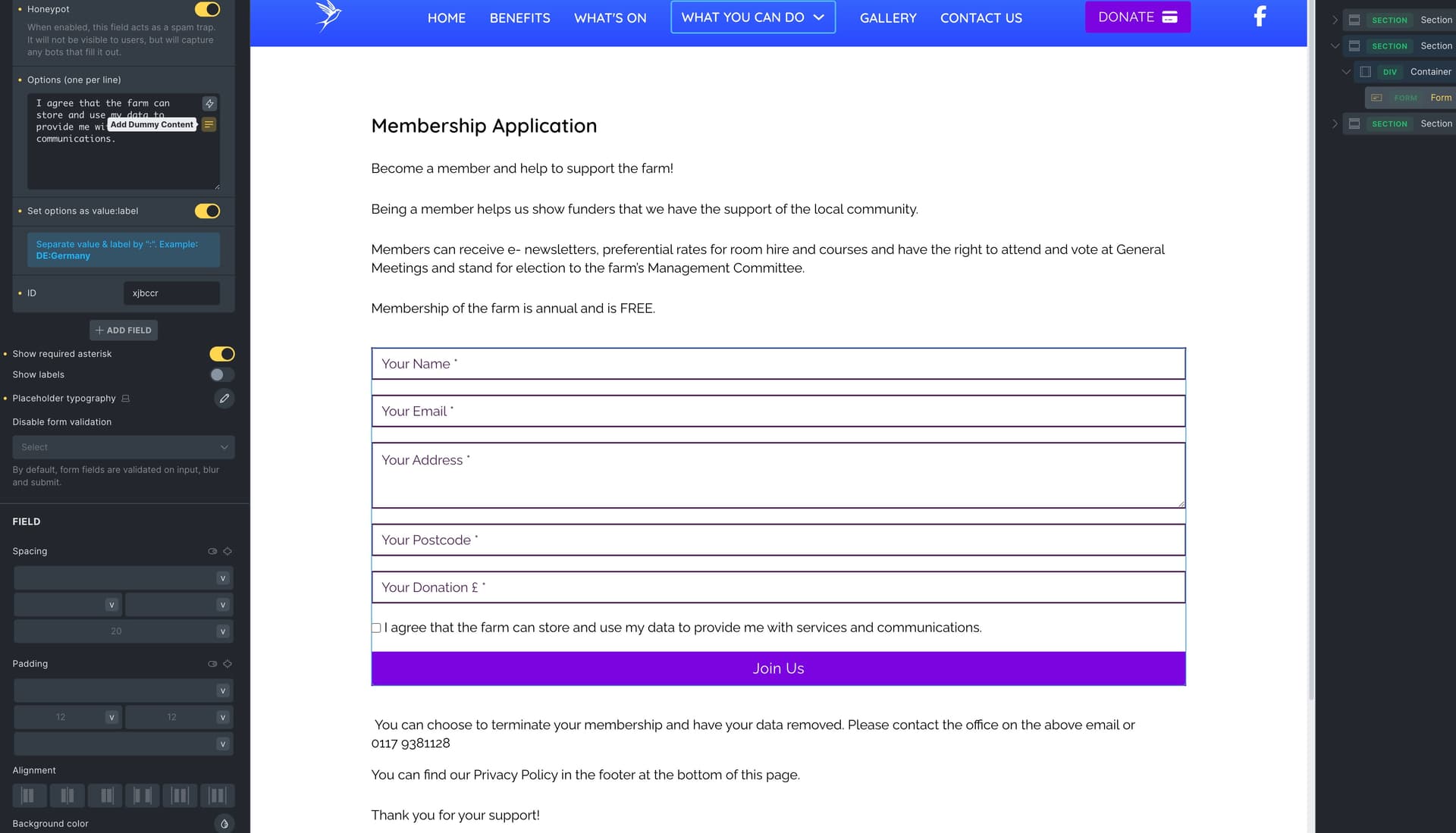I’ve created a form for a membership request. Everything seems to work excpe the checkbox which asks them to agree use f their date.