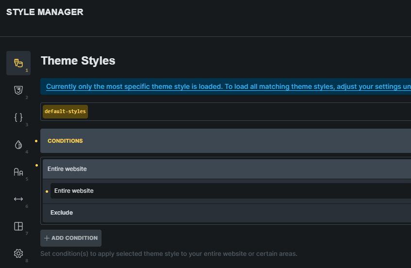 This “set to entire site” clarification is helpful towards my thinking. Reason for my post: ChatGPT said “having entire site” selected would null secondary… this didn’t seem correct. I will check on my second styles when I get back to that. Thanks so much for the clarification. I will let you know if I run into anymore issues.