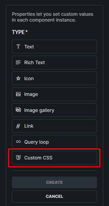 you can use attribute to apply custom CSS like create text property in the component then on the element where you wanted to apply CSS add attribute name “style” then connect the value with property you created in component.