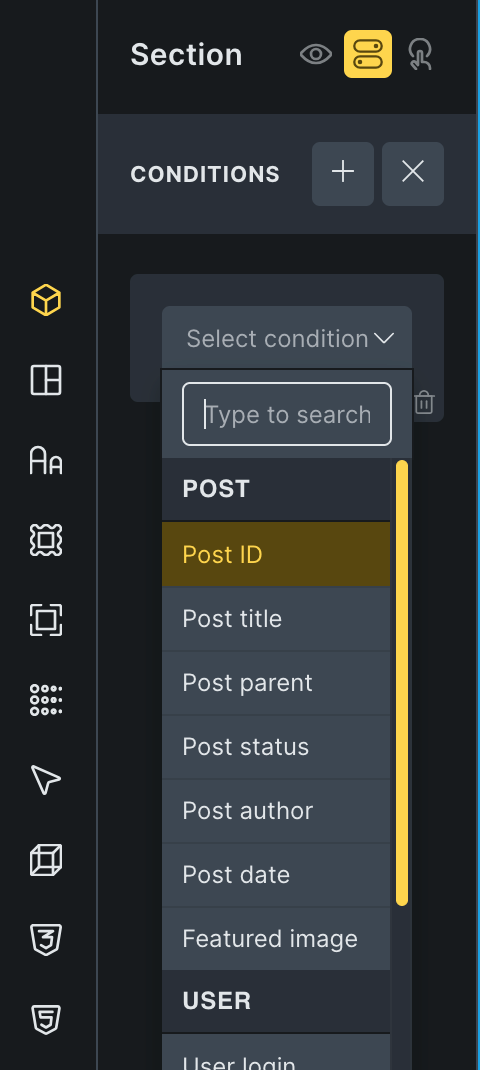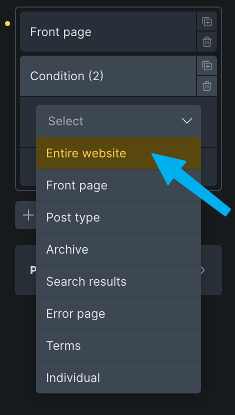 But when I edit e page template (or Content template) I cannot get that type of settings and all I can do is, selecting a section on the right panel, trying to set conditions for that section. But here I’ve got a different type of condition settings: