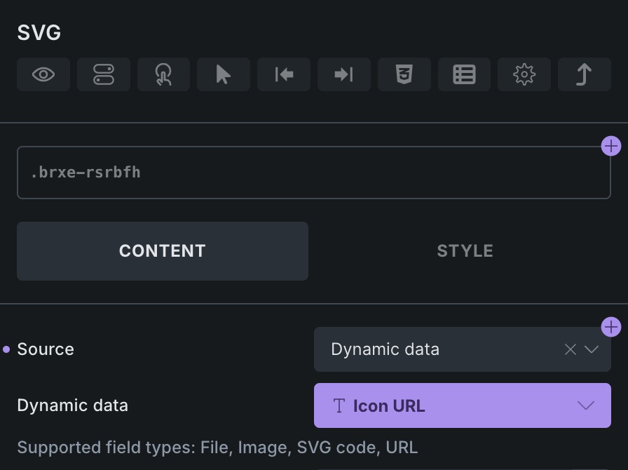 If I try the same with an “icon” element then the only input with a connection icon is the “dynamic data” one and this will only let me select the “text” property. If I de-select “dynamic data” and pick SVG instead then there are again no connection icons to allow me to connect to the icon property.