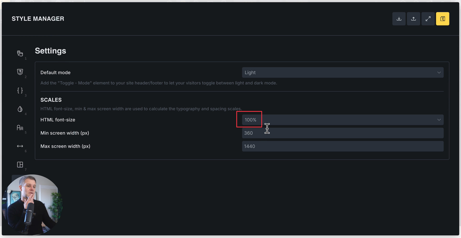 Ps: Iām watching the last few minutes of the video right now, but I havenāt seen you regenerating the variables (unless I missed it) after setting the HTML font size to 100%. So I still think thatās exactly whatās causing the problem.