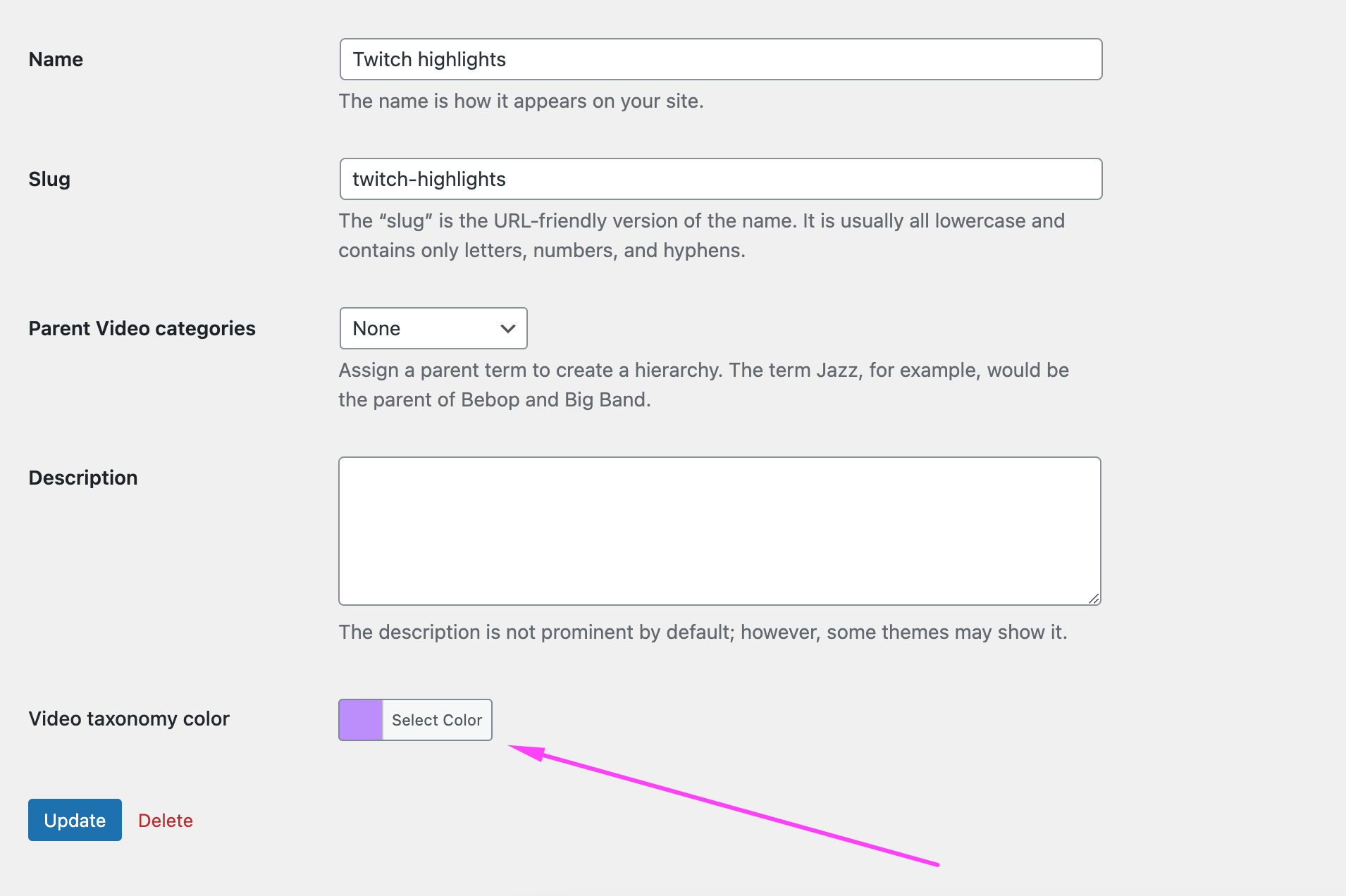I want to give my CPT taxonomies a specific color as background on the card for the archive. I made a custom field with the slug: video_taxonomy_color