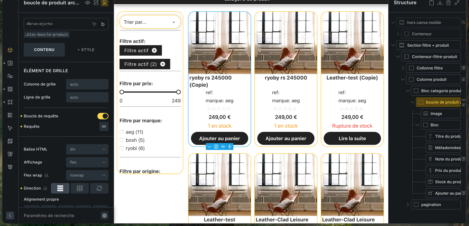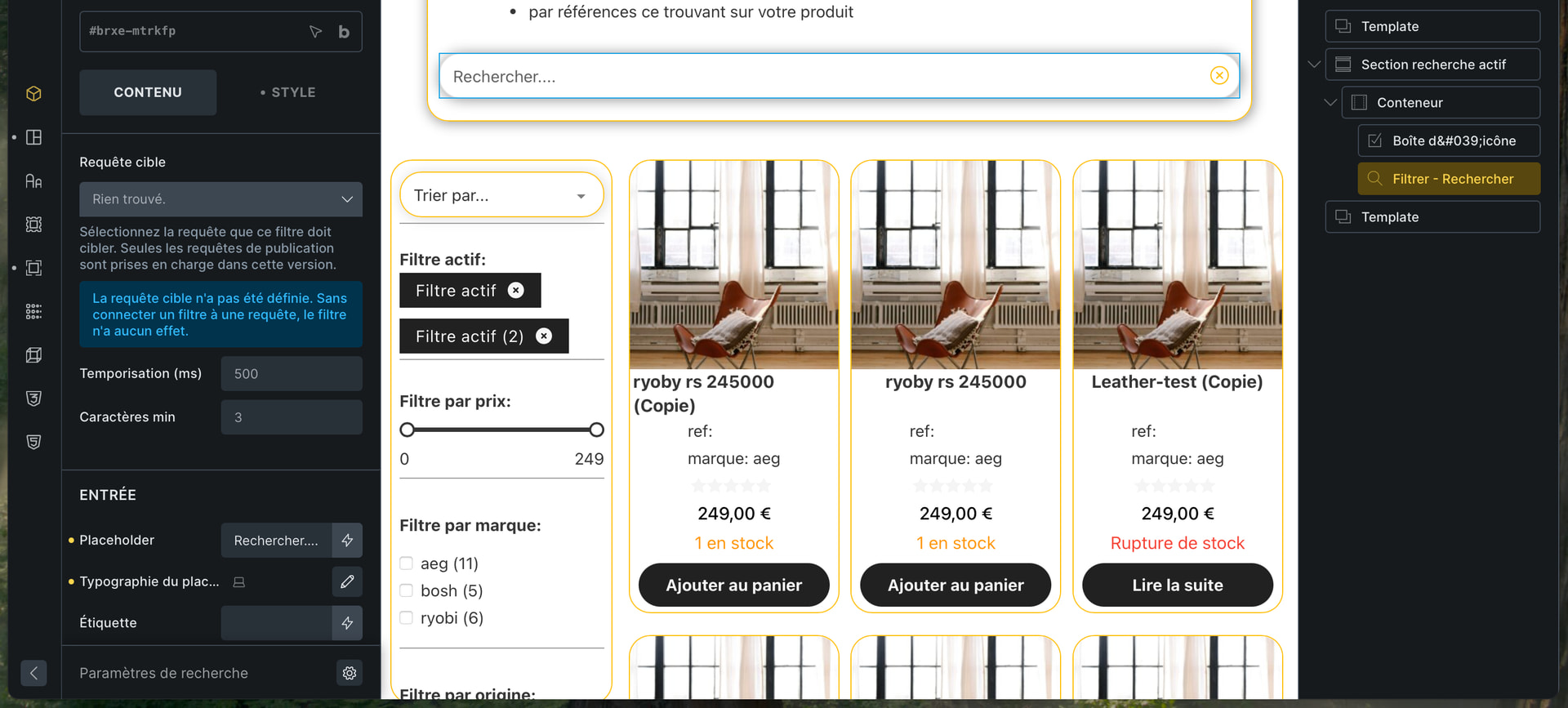 I created a unique template with a two-column container: the first column for my filters and the second for displaying the page’s products.