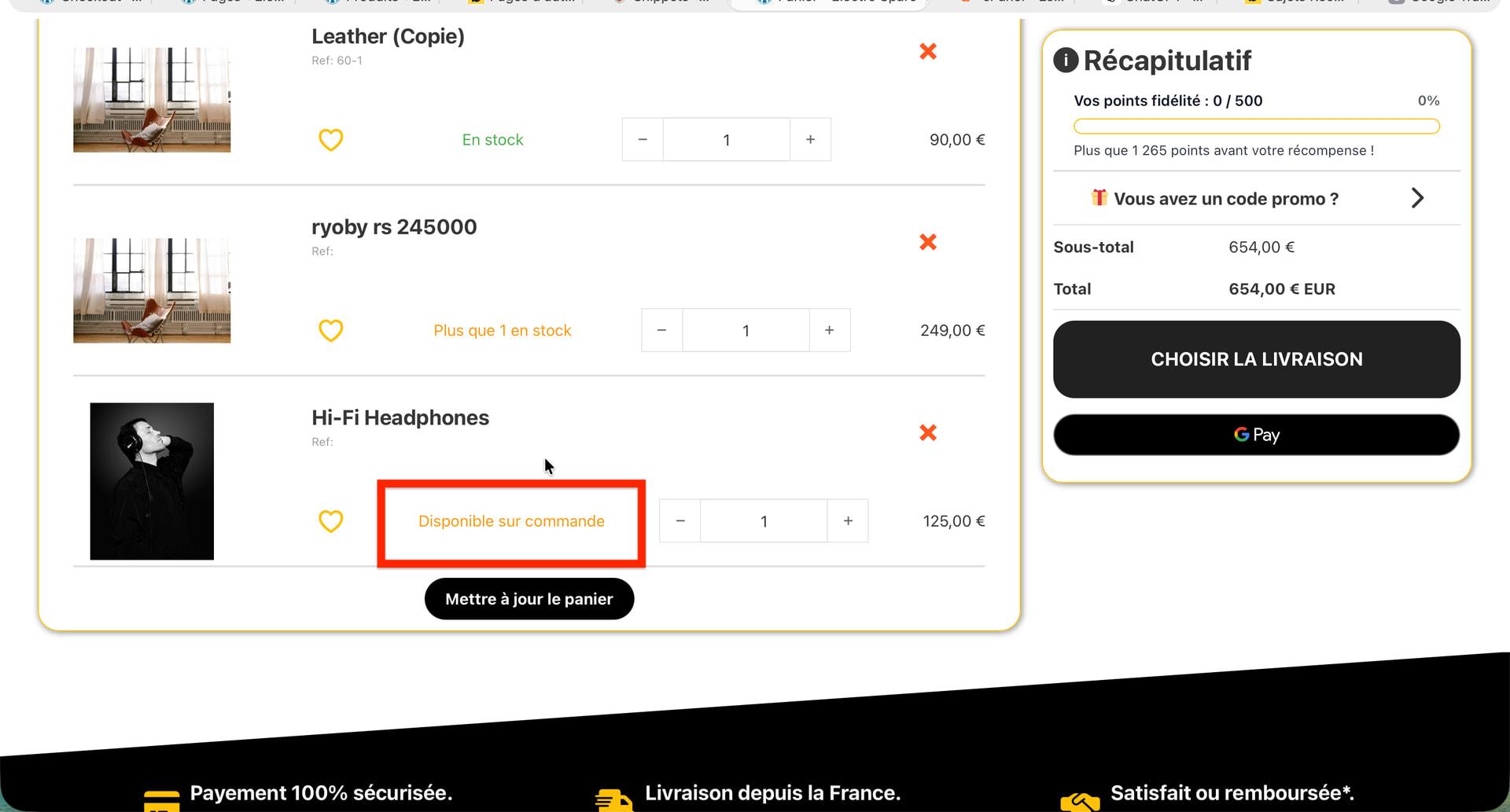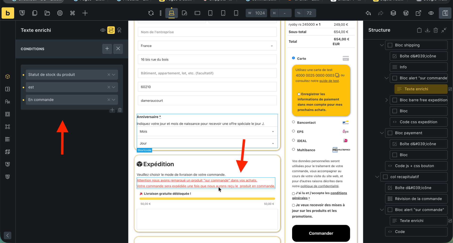 * Description: {echo:...} functions to show/hide Bricks elements depending on products' stock status in the cart (e.g. “sur commande”).