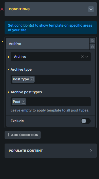 However, I believe that the page selected as the “Posts Page” in WordPress should be treated as a Posts Archive by default. Otherwise, the option to select Post under the Archive Condition loses its significance.