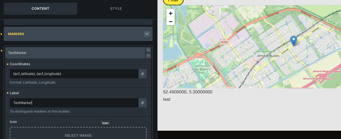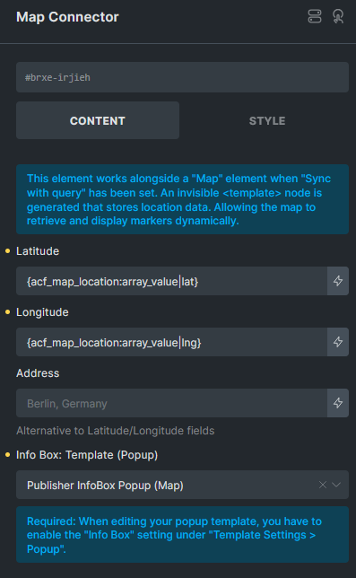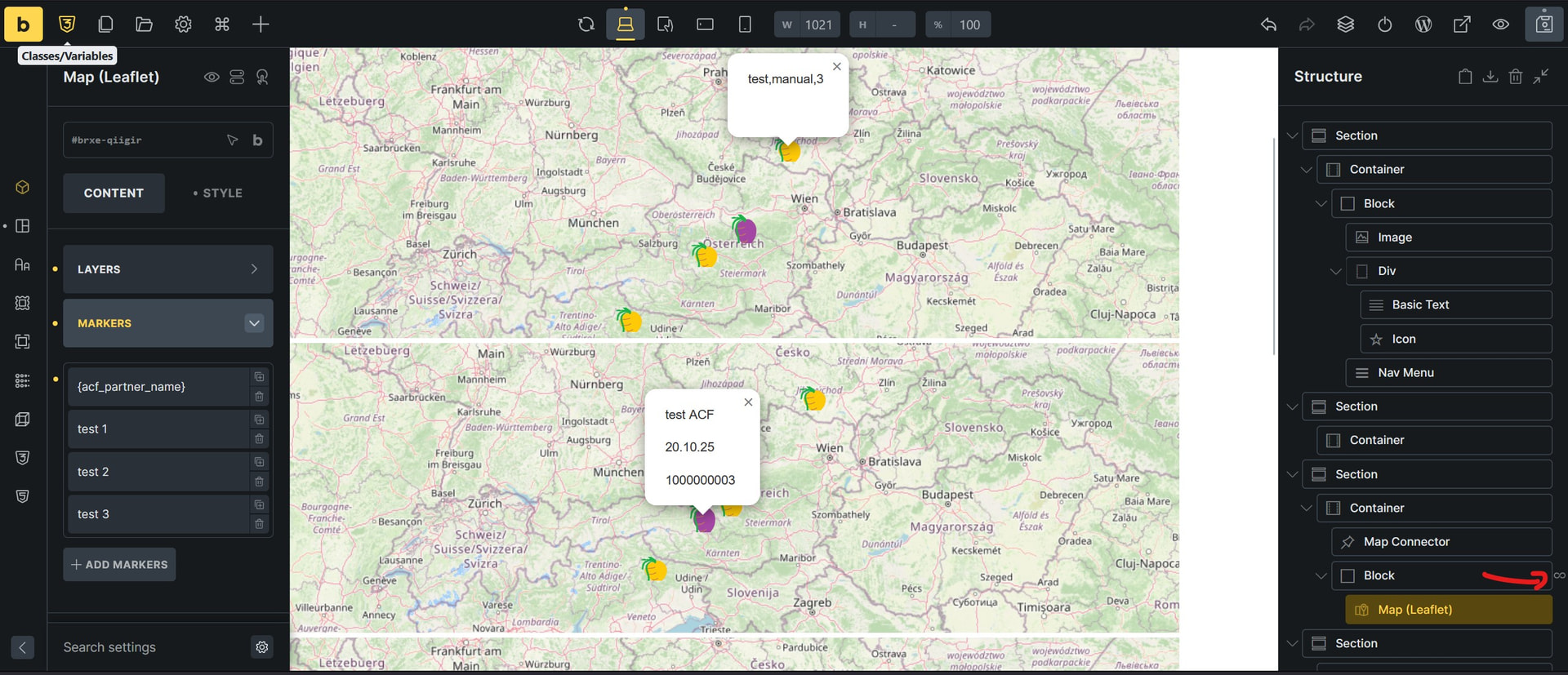 I’m trying to use dynamic data from ACF fields in the Map (Leaflet) element, but I can’t figure out how to connect them properly.