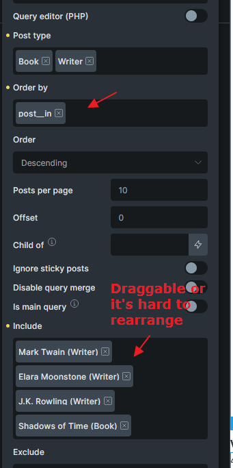 Agreed! This is the first time I’ve even used the “include list” sort option (learned it today), and thankfully in my case I only have 3-5 items I need to sort, but I can’t imagine how that’d work if I had way more that needed to be explicitly set. Drag & drop of the items absolutely needs to be added here. Hoping this gets added for 2.0.