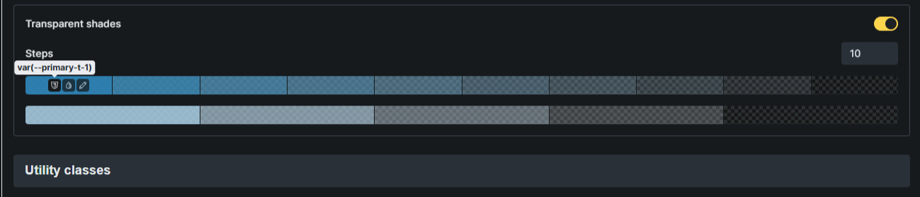 The Issue: While Dark and Light variants start with the subtle change at “-1,” the Transparent variants start with the heaviest opacity at “t-1” (approx. 90% or darkest) and end with the most transparent at “t-10” (approx. 10% or lightest). This breaks the mental model established by the other shade generators.
