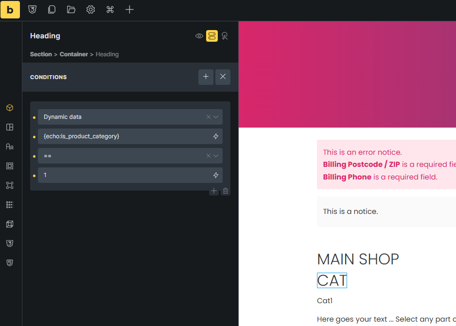 I am trying to display a header, based on the is_product_category condition. I registered the function in my functions.php as required by bricks to echo, created a dynamic data condition checking for is_product_category == 1, and added the label to display, but it doesn’t show up.