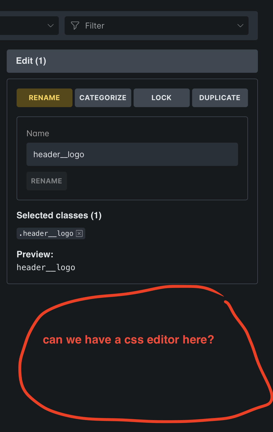 What I dream of is a section of the Classes panel (where I can now rename, delete, categorize and duplicate a class ) where we can also edit the class properties in a css editor or maybe in a property:value pairs or anyhow. I attach a screenshot what I mean: