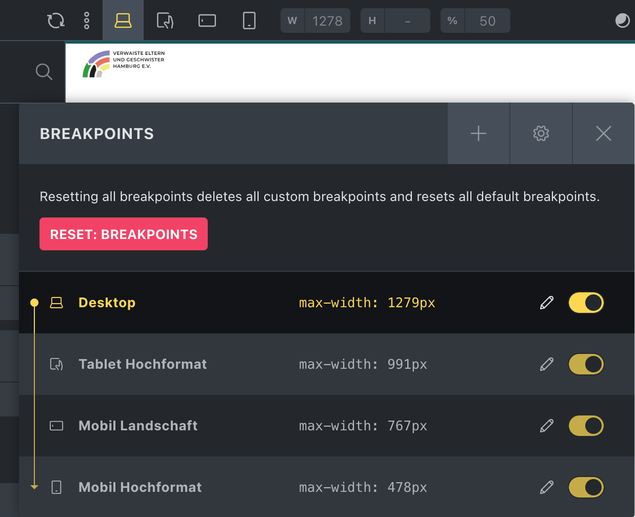 I assume you added the larger breakpoint and set it as base, right? If so, it’s understandable that the layout looks broken, since the breakpoint doesn’t have any styles. All styles are still located on the desktop breakpoint and smaller (as shown in the screenshot when resizing your viewport). Transferring styles from one breakpoint to another is not yet possible, but it is on our radar (Advanced Themer already provides this feature).
