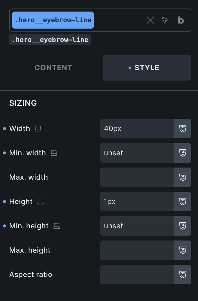 I am attaching the JSON of the section which contains these particular set of elements, hopefully this will help in diagnosing the issue (and so you can see the current values for the sizing and everything on the eyebrow line. I did redact the source URL though for now, I hope that is okay.