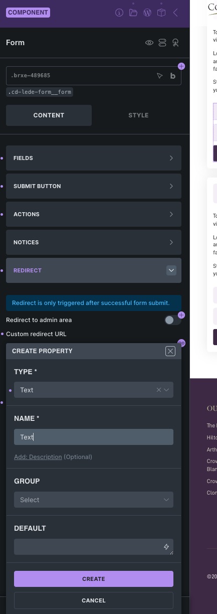 I think I have found a bug or at least something that could work better for the intended purpose. I have created a component with a Bricks Form in it. In the Component > Form I add under the ‘Actions’ tap ‘Redirect’. In the Redirect tab I see under the ‘Custom redirect URL’ an option for a component field. But the only field I can link to it is a ‘Text’ field not the desired ‘Link’ field. Even if I create a ‘Link’ field I can’t attach it to the ‘Custom redirect URL’ component field. Is this intentional? I would assume a ‘Link’ field is the correct option unless I am missing something?