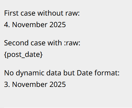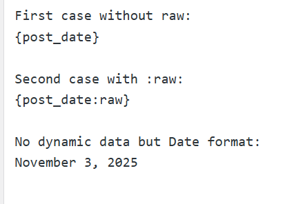 If I type {post_date} in backend texteditor it should display {post_date} in front end and not 3. November 2025. How could :Fj,Y help here?