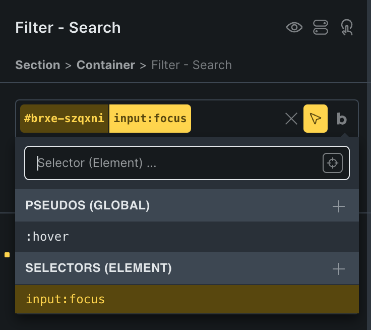 I tried setting the focus state on the filter-search element to increase its width when focused. It works in the Builder when the focus state is active, but it doesn’t work at all in the frontend.