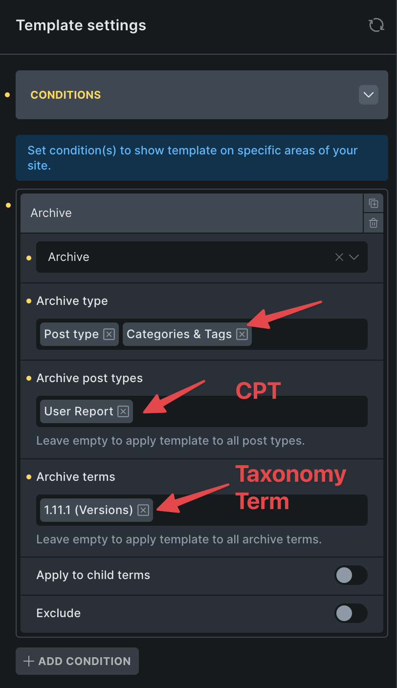 Post Template Conditions : post type - test, Terms - category1