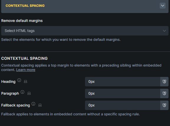 As far as I can see, there’s nothing set for “Remove default margins » Select HTML tags”. Just add the p there, and you should be good to go.