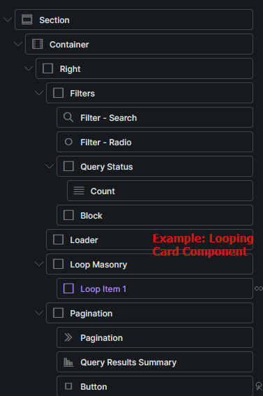 NOTE: If you plan to use Query Filters feature for the target Query, please use Method 2. Because Filter elements wouldn’t work inside the Component. Each filter element must have a unique element ID.