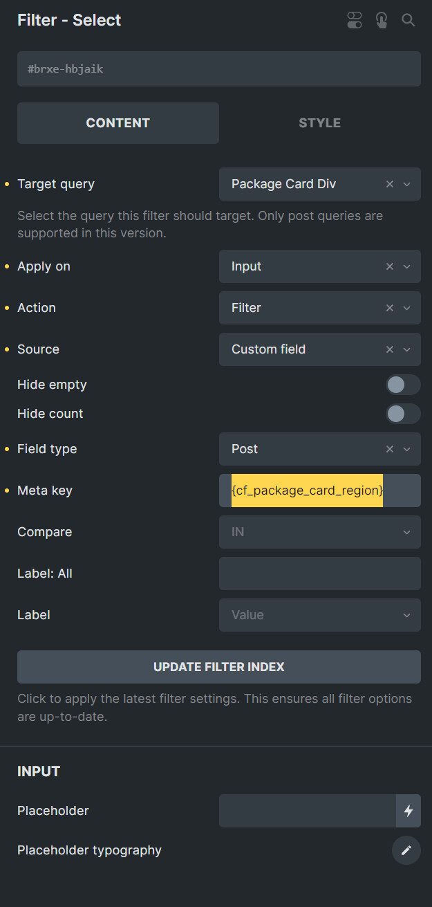 I have a query and want to sort it with a Filter - Select Element. I want to filter by custom field. I use Metabox. My custom field in Metabox has this id: package_card_region
