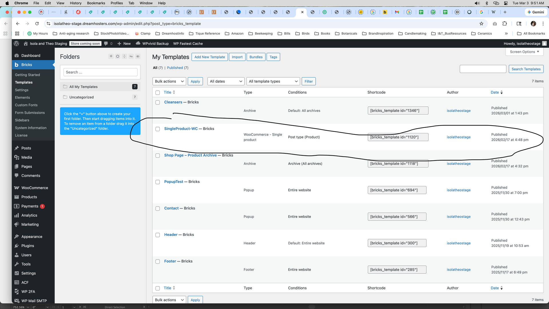 I think you’re on to something, Shingren, with the “Rendered with Bricks”. I never noticed, just on that template it says Rendered with WP. The “Cleansers” category page that displays right says “Rendered with Bricks” and works fine.