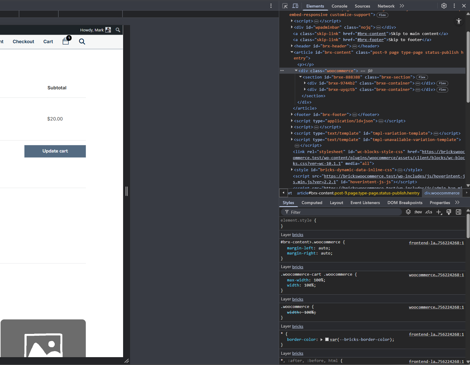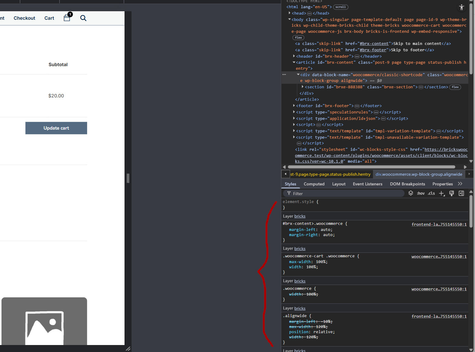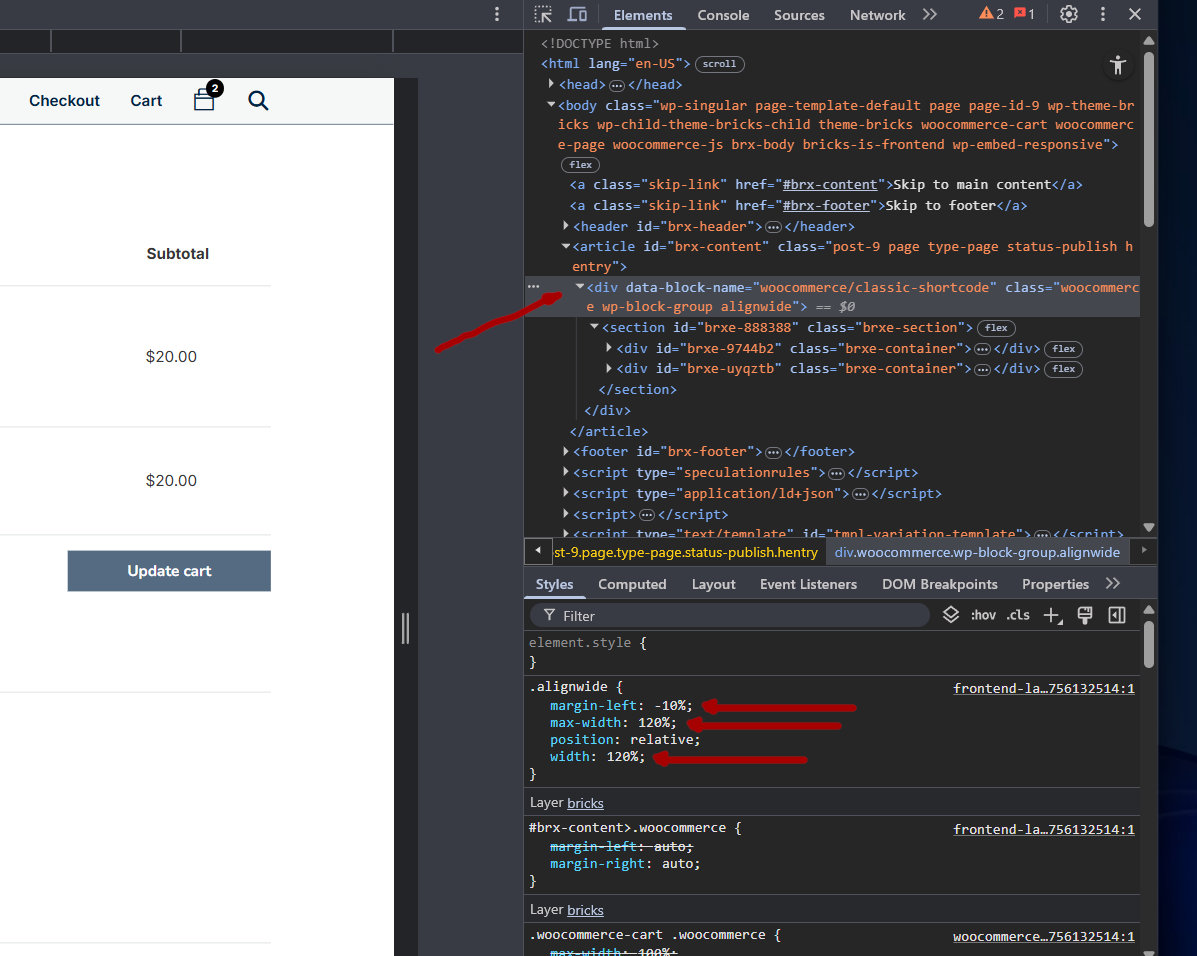 After updating Bricks to v2.0.2, the Cart, Checkout, Checkout Thank You (checkout/order received) and Empty Cart pages have some bad CSS that makes margin-left: -10%, width: 120% and max-width: 120%