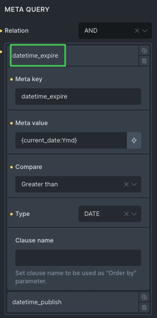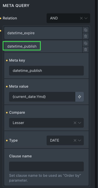 For my Announcements custom post type, each announcement is given a publish date and expire date. My goal is to only display an announcement card when the publish date {acf_datetime_publish} is >= the Current WP Date {current_wp_date} and hide the card if the Current WP Date {current_wp_date} is > the expire date {acf_datetime_expire}.