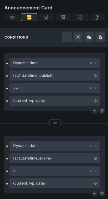 I’m looking for help to dynamically show/hide an announcement card in a query loop on a page, relative to the publish and expire date fields as defined by ACF Date Time Picker fields.