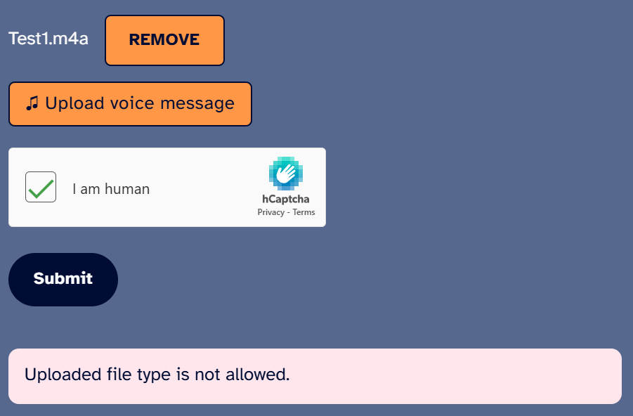 - Attempt to upload m4a = error (msg = “Uploaded file type is not allowed”) + no file in media library