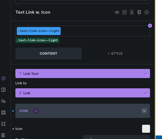 Basically, you can create your own “icon + text link” component by simply placing an icon and a basic text element in a div and saving it as a component. Then you can create the properties individually.