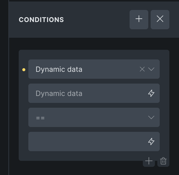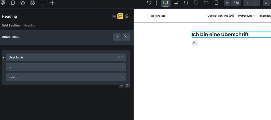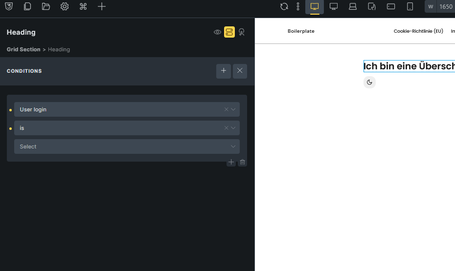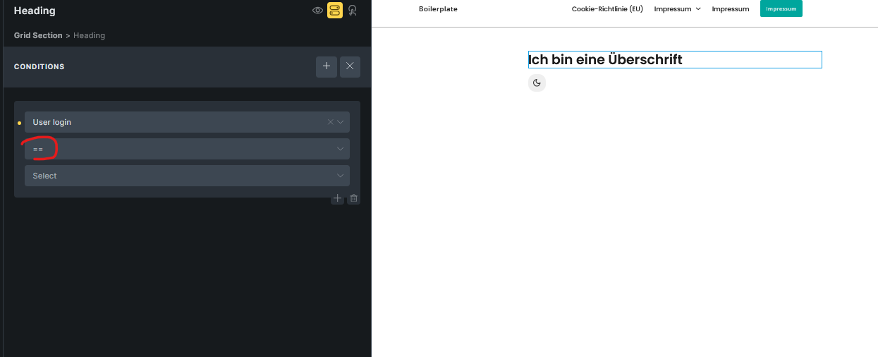 We can see that the User login Condition should have a placeholder of ‘is’. But when we first add this Condition we see a ==. This is true for any Condition, that the Placeholder only gets displayed, after it has been set once: