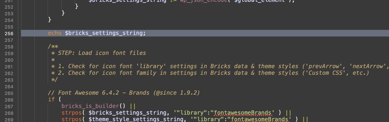 Oook, so got the assets.php file to output of the $bricks_settings_string right before icons sets loaders are checked.