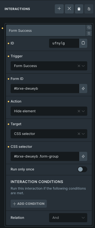I’m attempting to use Interactions to hide the native Bricks form upon successful submission, and it does seem to work. However, I notice the success message doesn’t display since the entire form goes away. Is there a way to set up the form interaction such that the form field(s) and submit button are hidden after a successful submission but still allow the inline success message to display?