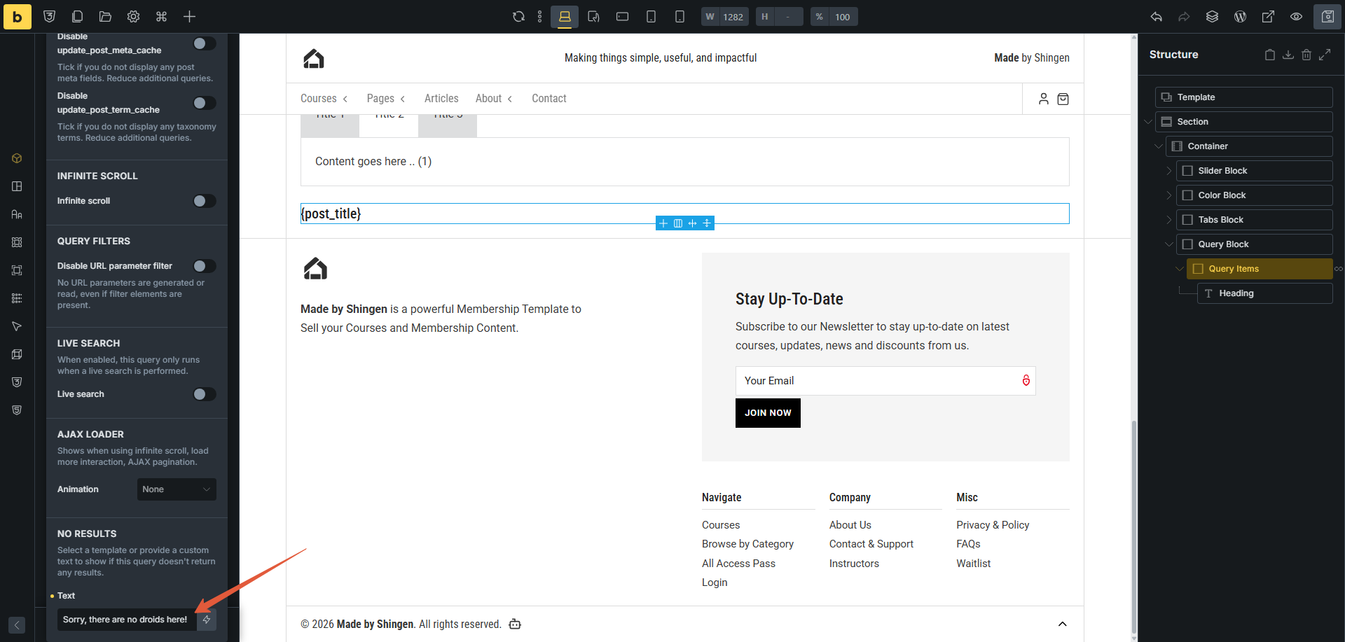 I started this one expecting this to be easy but have now wasted a huge amount of time with chatGPT trying to find a solution - but the simple scenario is that I have a query loop (of hotels) attached to a Bricks single page template. The query loops works great (and just happens to feed a Bricks Pro Slider) display element. The problem is that on certain pages there are ‘No Results’ for the page, for example one of the region pages simply does not have any hotels in it and so there are no results to show and so a ‘No results’ or similar message needs generating.