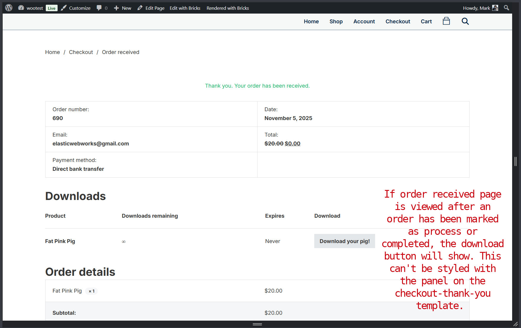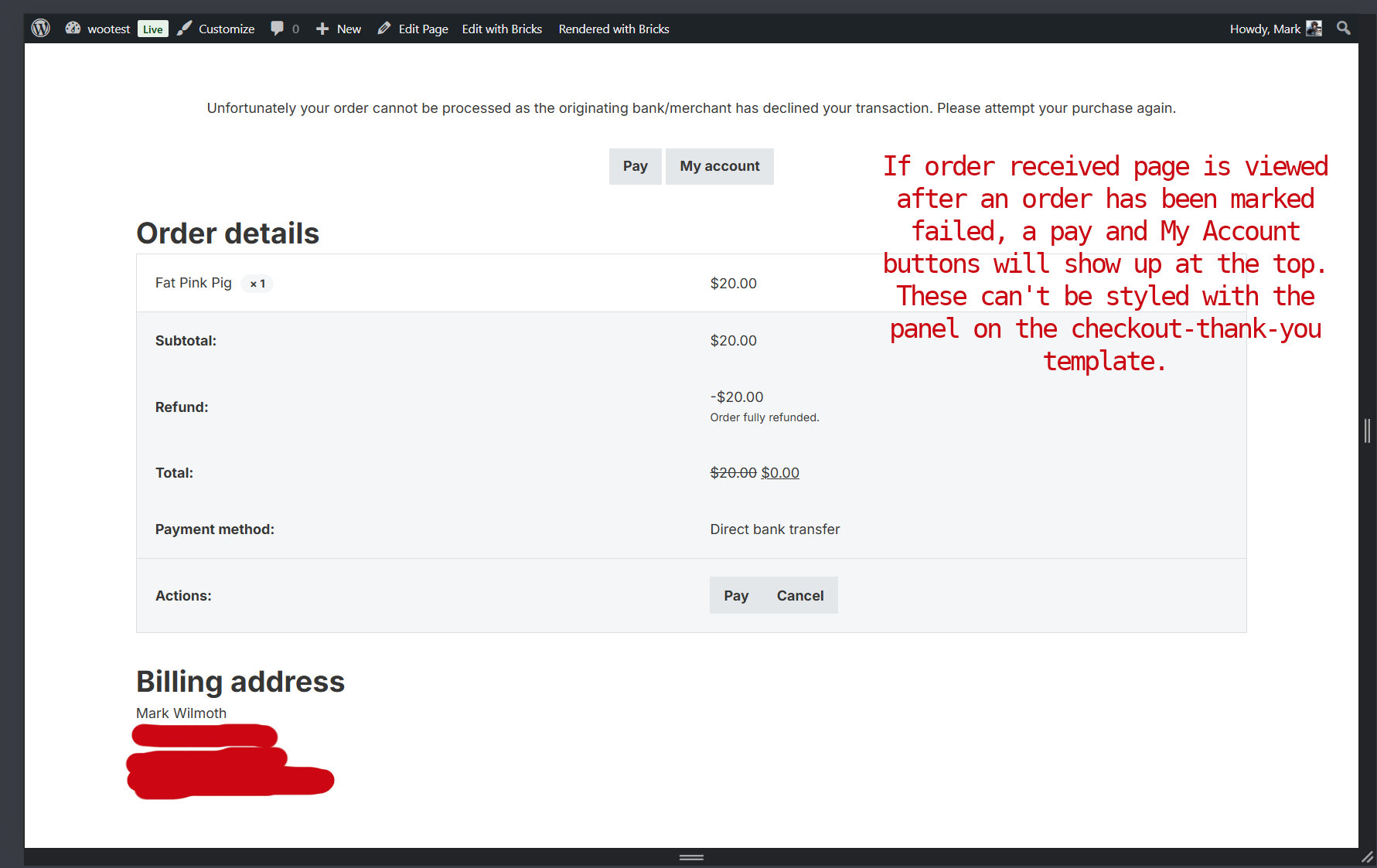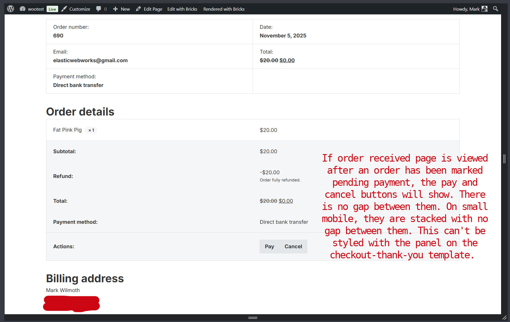 If the order received (checkout thank you) page is viewed after an order has been marked pending payment, the pay and cancel buttons will show. There is no gap between them. On small mobile, they are stacked with no gap between them. This can’t be styled with the panel on the checkout-thank-you template.