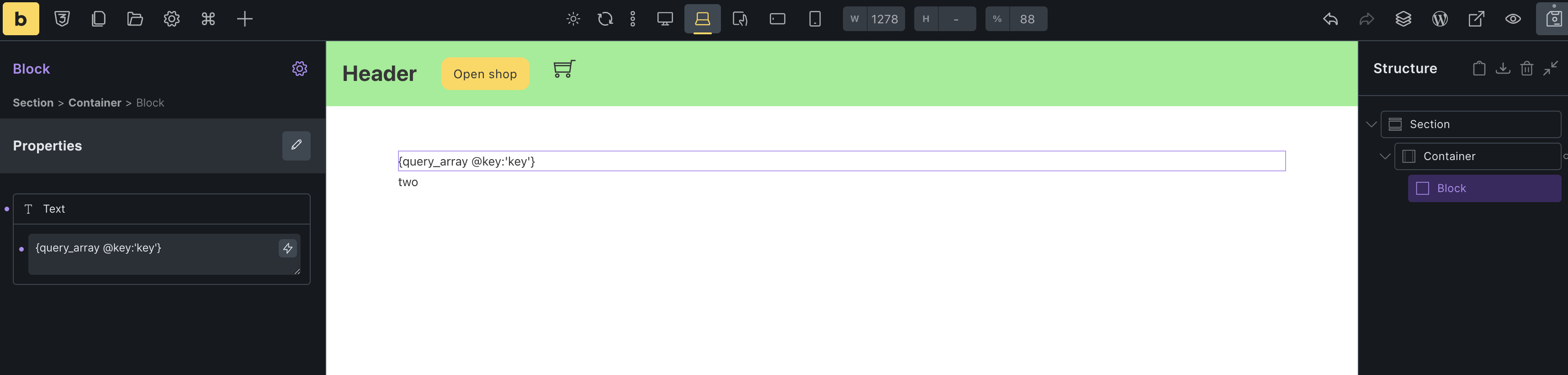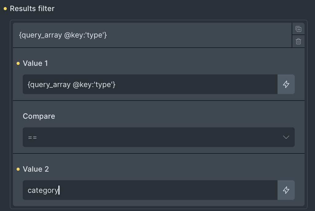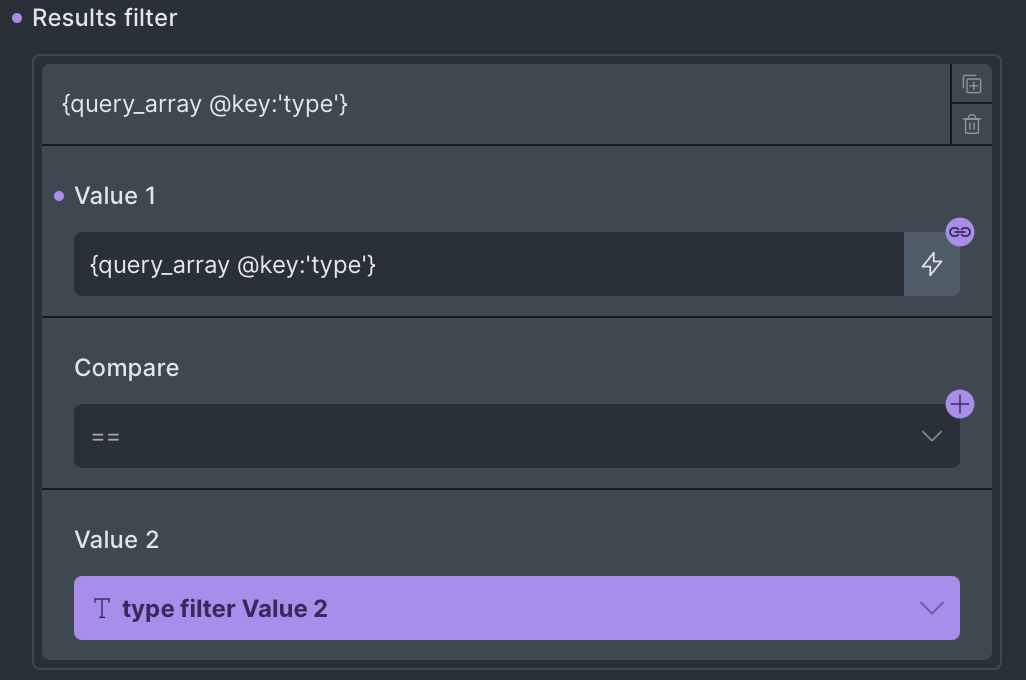 I use the Array filters to keep only {query_array @key:’type’} == XXX, but when I connect the XXX to a Text property, or a Select property, the query stops working.