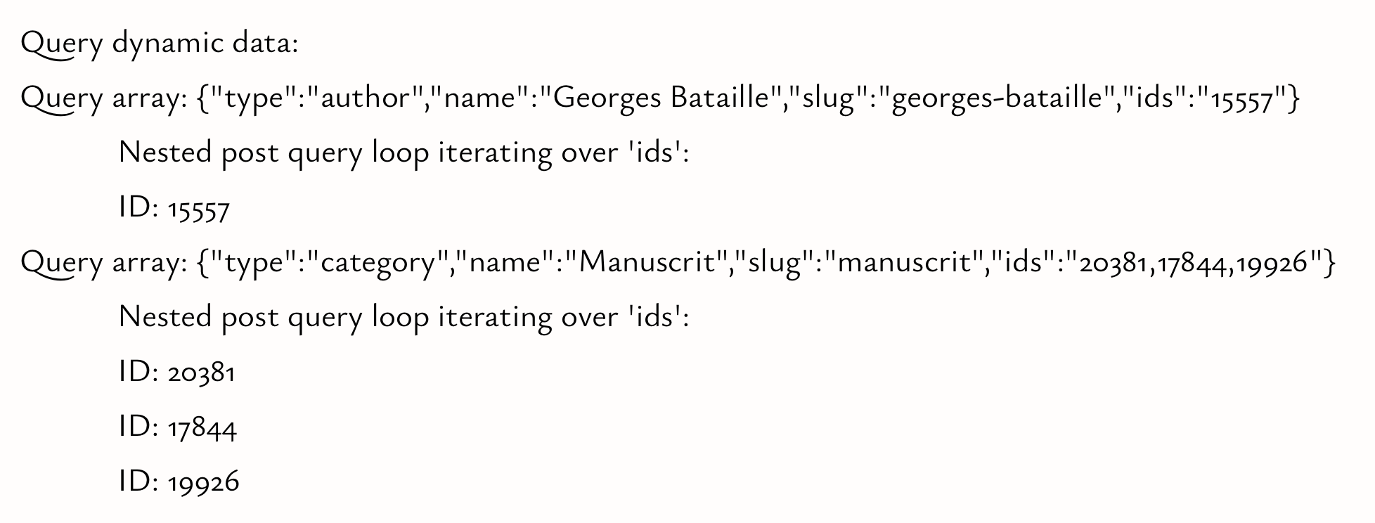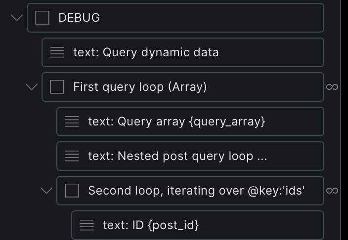 I can’t get the Array querry loop filters working with component properties. In my case, I have a custom php function that returns an array containing a name, a type, and an array of post IDs.