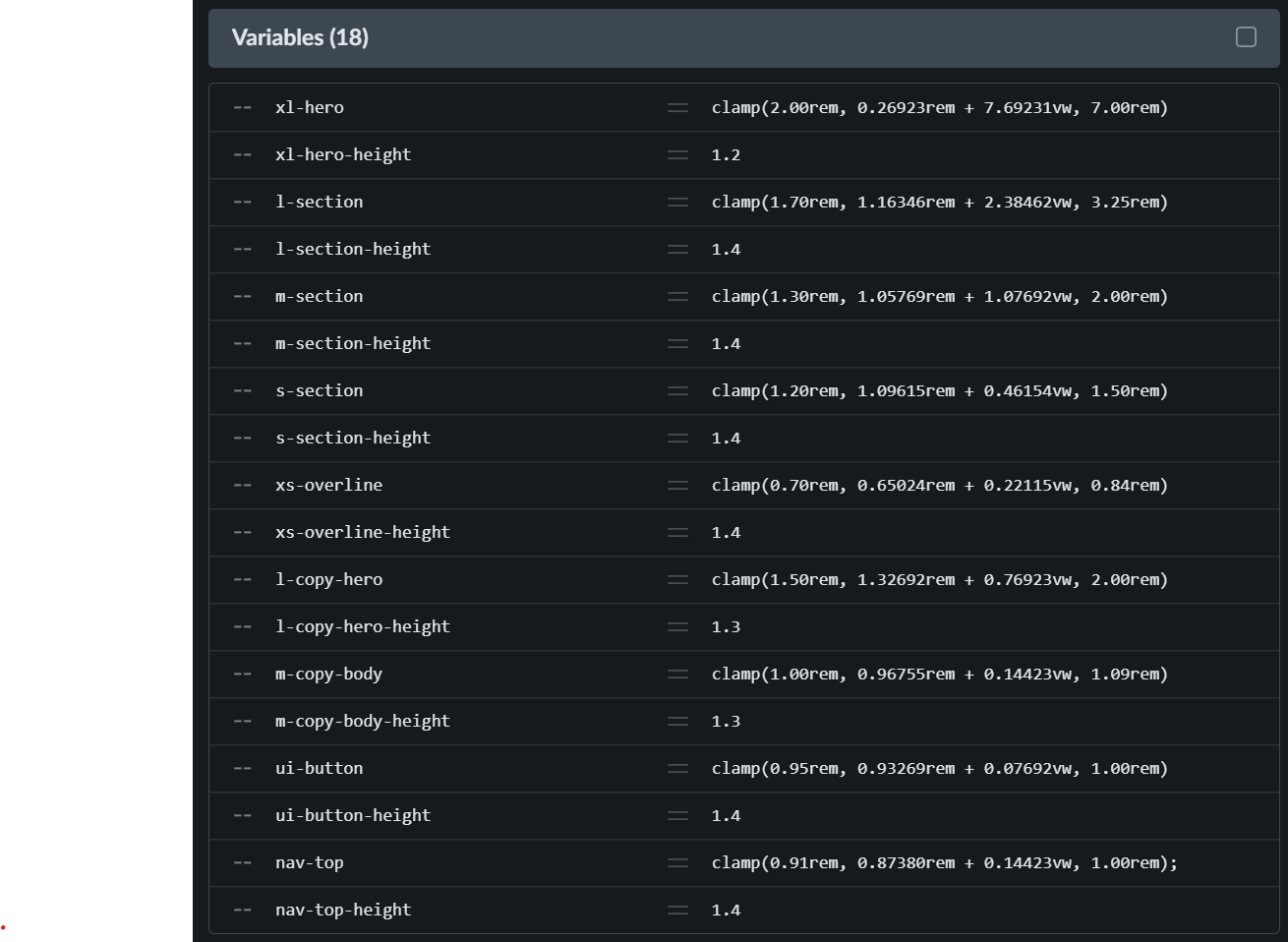 Even though I’ve set the clamp calculation to go from 13px to 14x (for a top nav menu item), between a view port of 380px up to 1400x, for some reason the font is showing up as <9px ???
