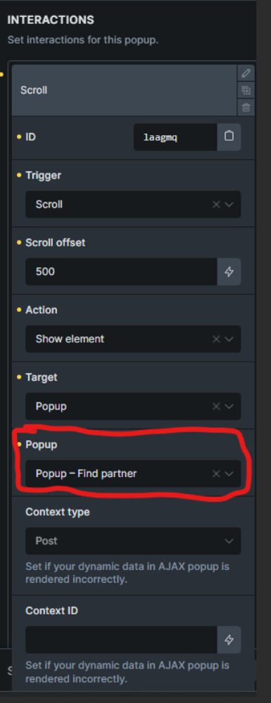 Apologies for the delayed response. Are you adding these interactions under âTemplate settings > Popup > Interactionsâ? if so, why arenât you targeting âselfâ like so: