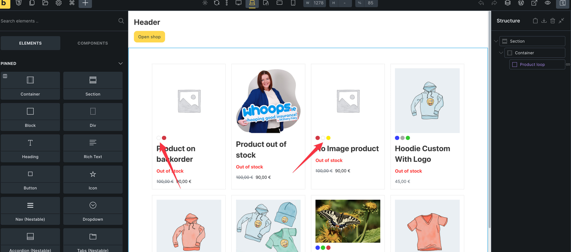 I’m not sure what the difference is, but in the first loop item, some of the colors are set as rgb. While in the other loop items in the builder and frontend they are as HEX! Since I’m targeting white with the selector [style*=“background-color:#ffffff”], it’s natural that the style isn’t applied. I even set the white color again in WooCommerce attributes, but it’s still loading as rgb in the first loop item. Please see the screenshot below.