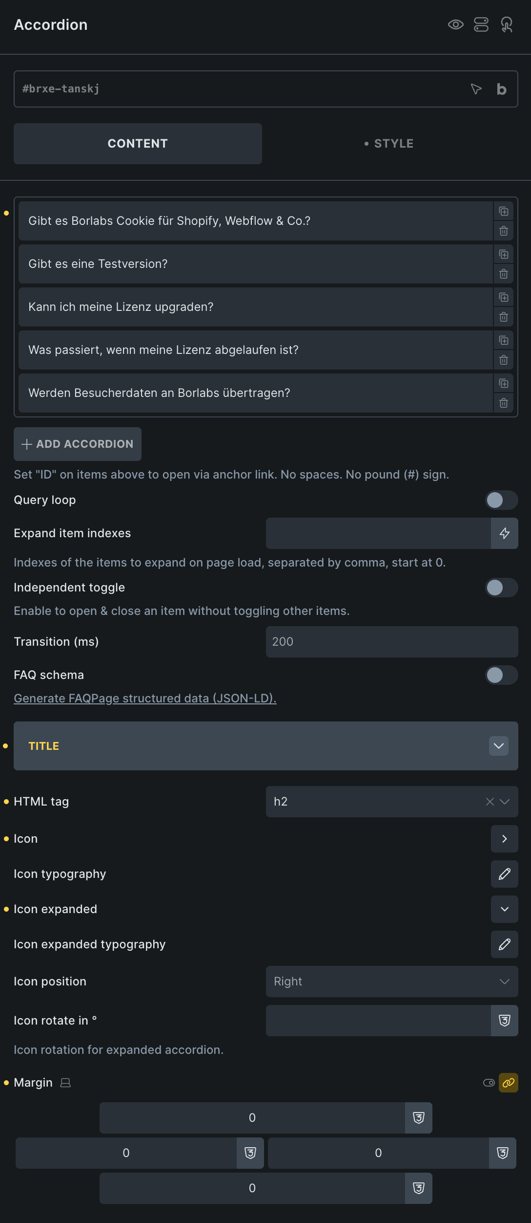 The margin styling applied to accordion titles is being overwritten by global heading settings, preventing element-specific styles from taking precedence as expected.