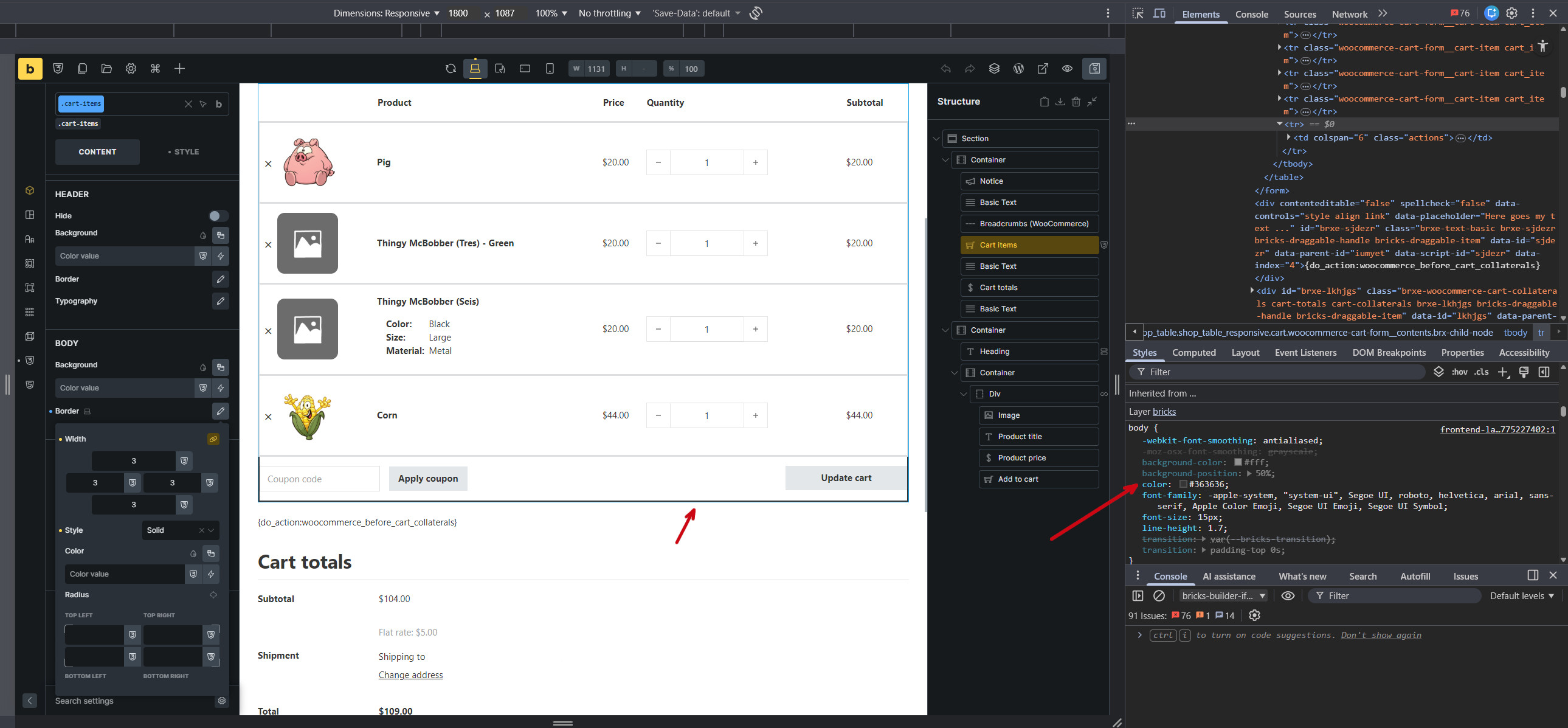In the builder only, when modifying the border on the cart items element >> products >> body, the last table row (<tr>) shows the default Bricks body color #363636 rather than var(--bricks-border-color).