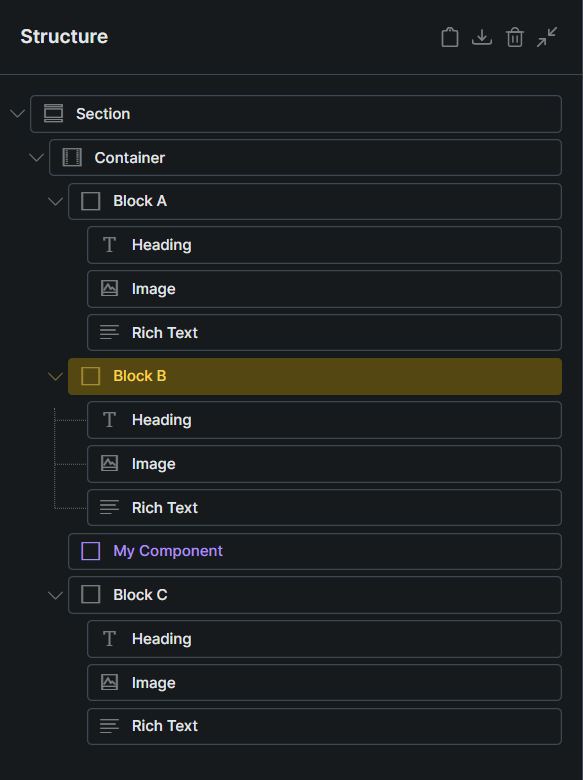 If Block B is NOT selected, the component is inserted at the position of the yellow indicator as expected.