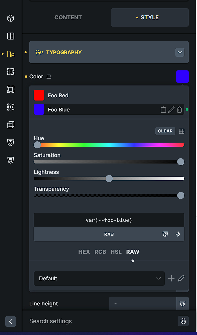 - Color 2 (Foo Blue): Value set as RAW var(–foo-blue).