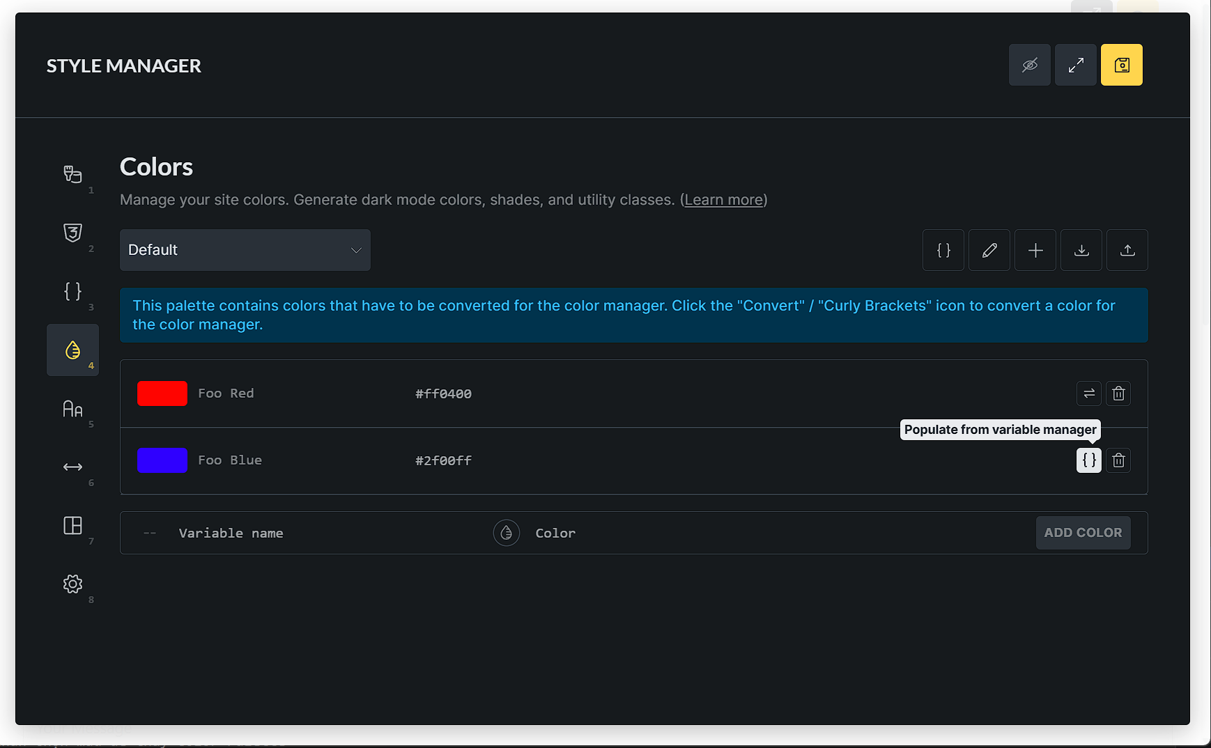 After upgrading to v2.2.0, two different actions were performed in the Style Manager for migration. Comparing “Convert color to variable” (Foo Red) and “Populate from variable manager” (Foo Blue) reveals the following bugs: